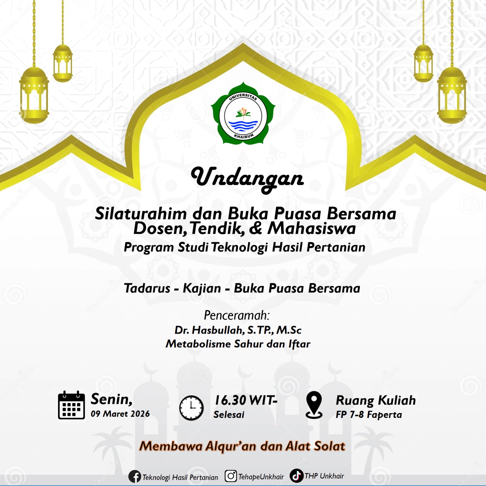 09 Mar 2026 adminweb Pengumuman Dibaca 43 kali Undangan Buka Puasa Bersama, 19 Ramadan 1447 Hijriah Invitation to Break Fast Together Lecturers, Teachers, and Students of the Agricultural Product Technology Studies Program of Khairun University.